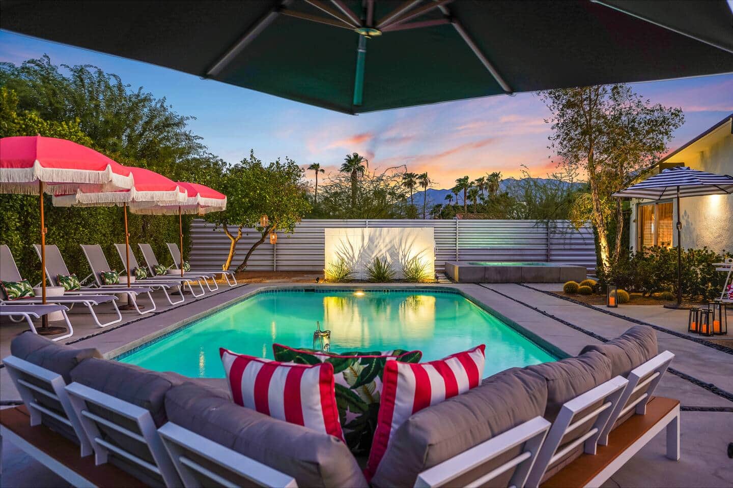 Lounge beneath the iconic pink umbrellas with a chilled drink in hand or gather around the firepit as the sun dips behind the San Jacintos. Every inch of the outdoor space is designed for connection, morning dips, golden-hour chats, and starlit soaks alike.